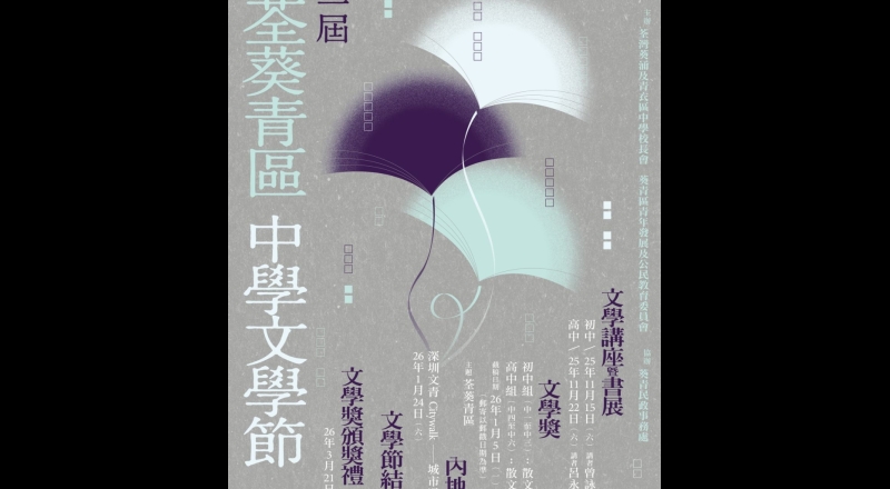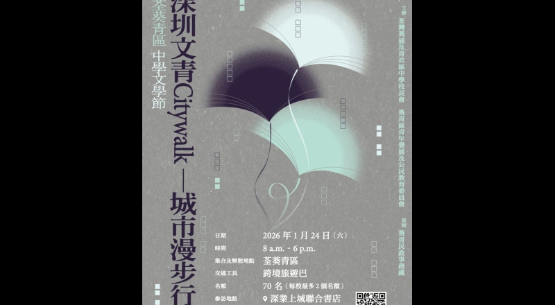 感謝荃灣葵涌及青衣區中學校長會、葵青區青年發展及公民教育委員會及葵青民政事務處的支持,第一屆荃葵青區中學文學節 「深圳文青Citywalk──城市漫步行旅」 即將在2026年1月24日(星期六)舉行。為讓同學對寫作不同文體的作品有更深入認識,是次活動將帶領學生跨越本地到訪鄰近城市——深圳市,走訪書店、文化創意園區,以行腳之旅發掘寫作的可能。以下是活動資訊: